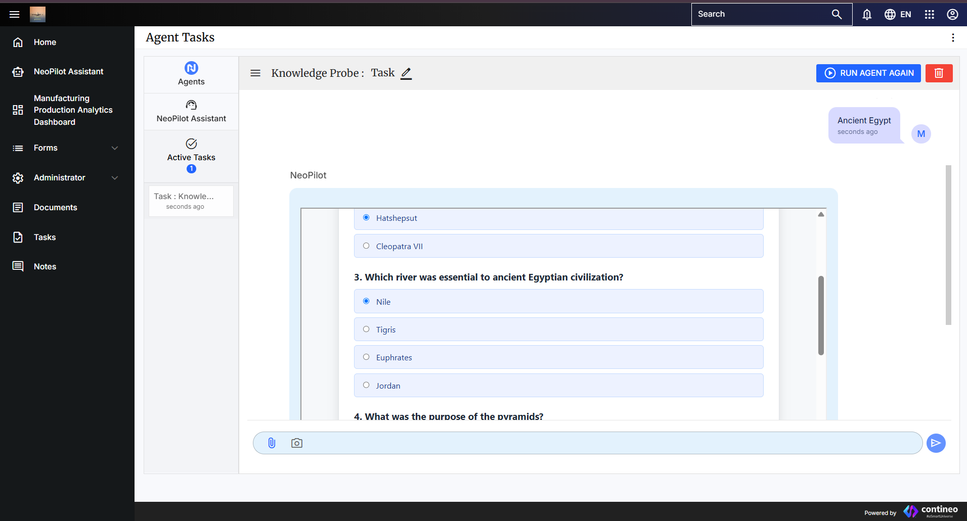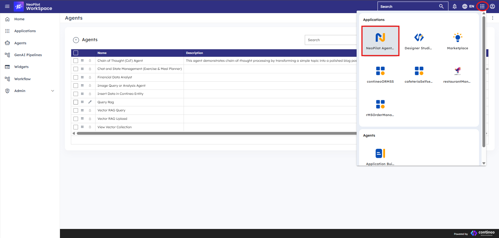 If you are not already in the NeoPilot Agentic AI Engine, click the application palette (grid of dots) in the top-right corner and select NeoPilot Agentic AI Engine.