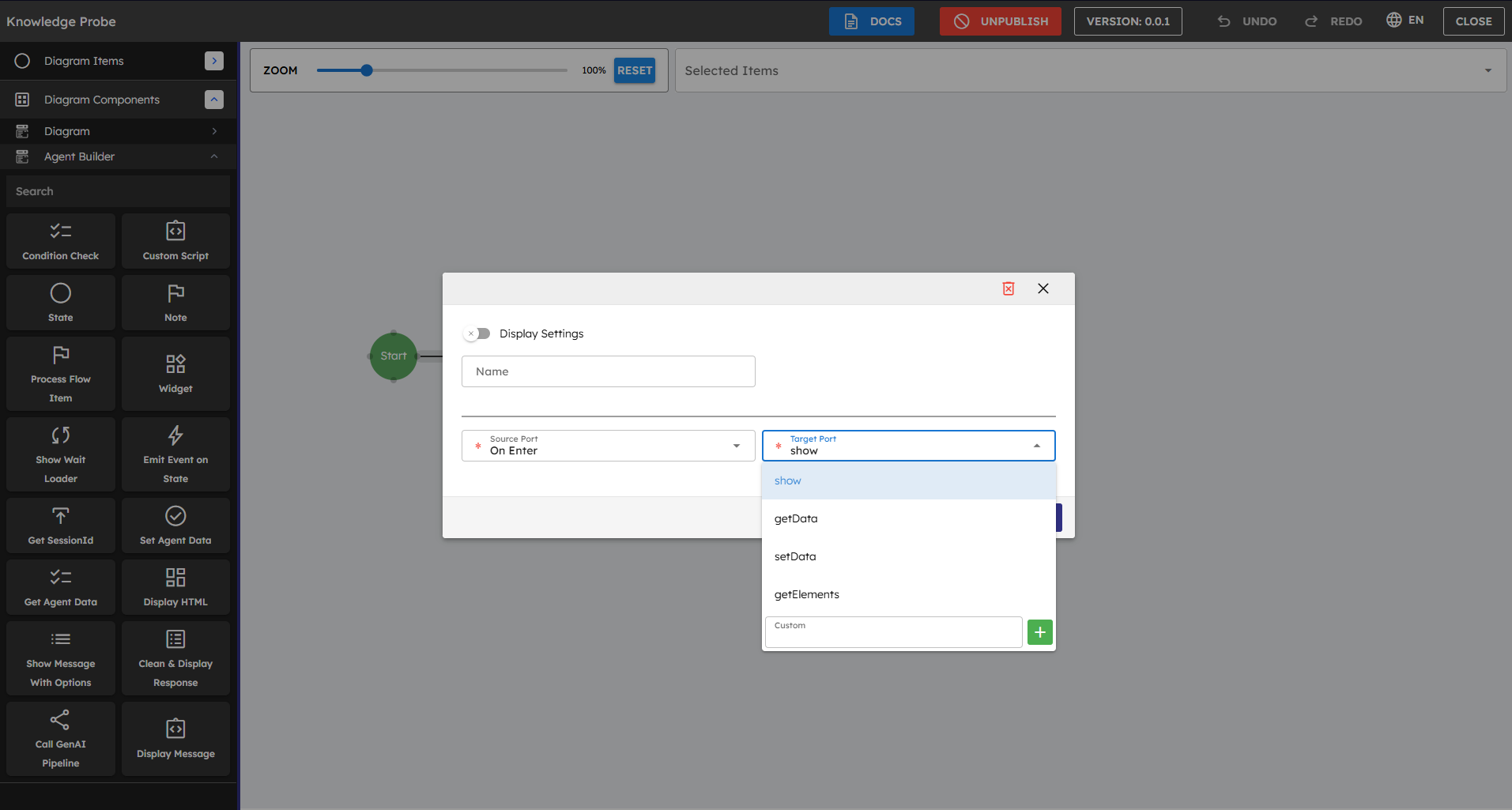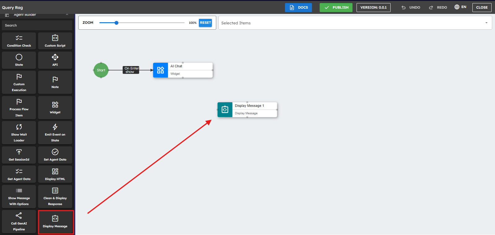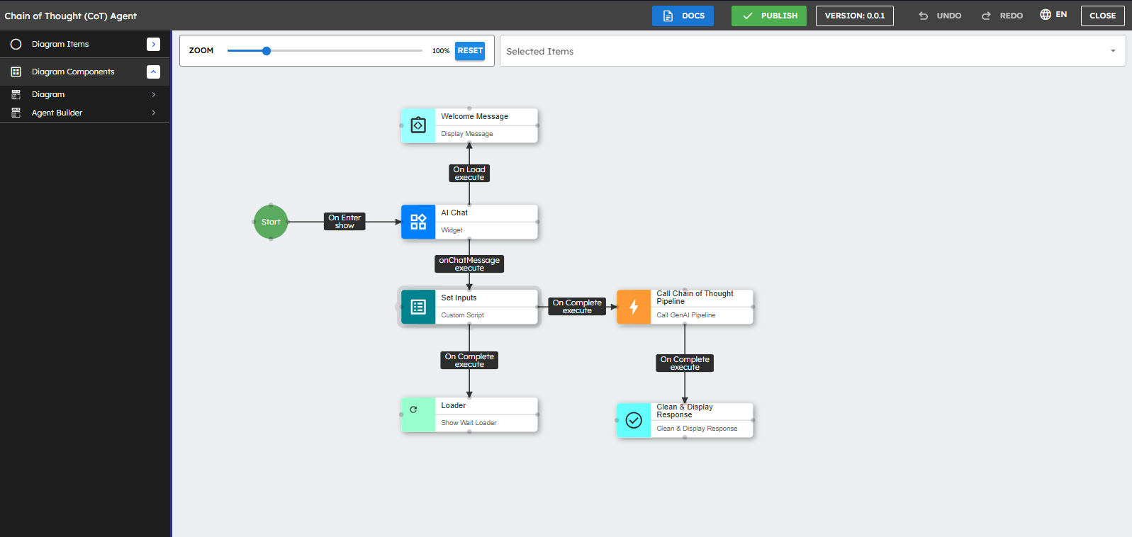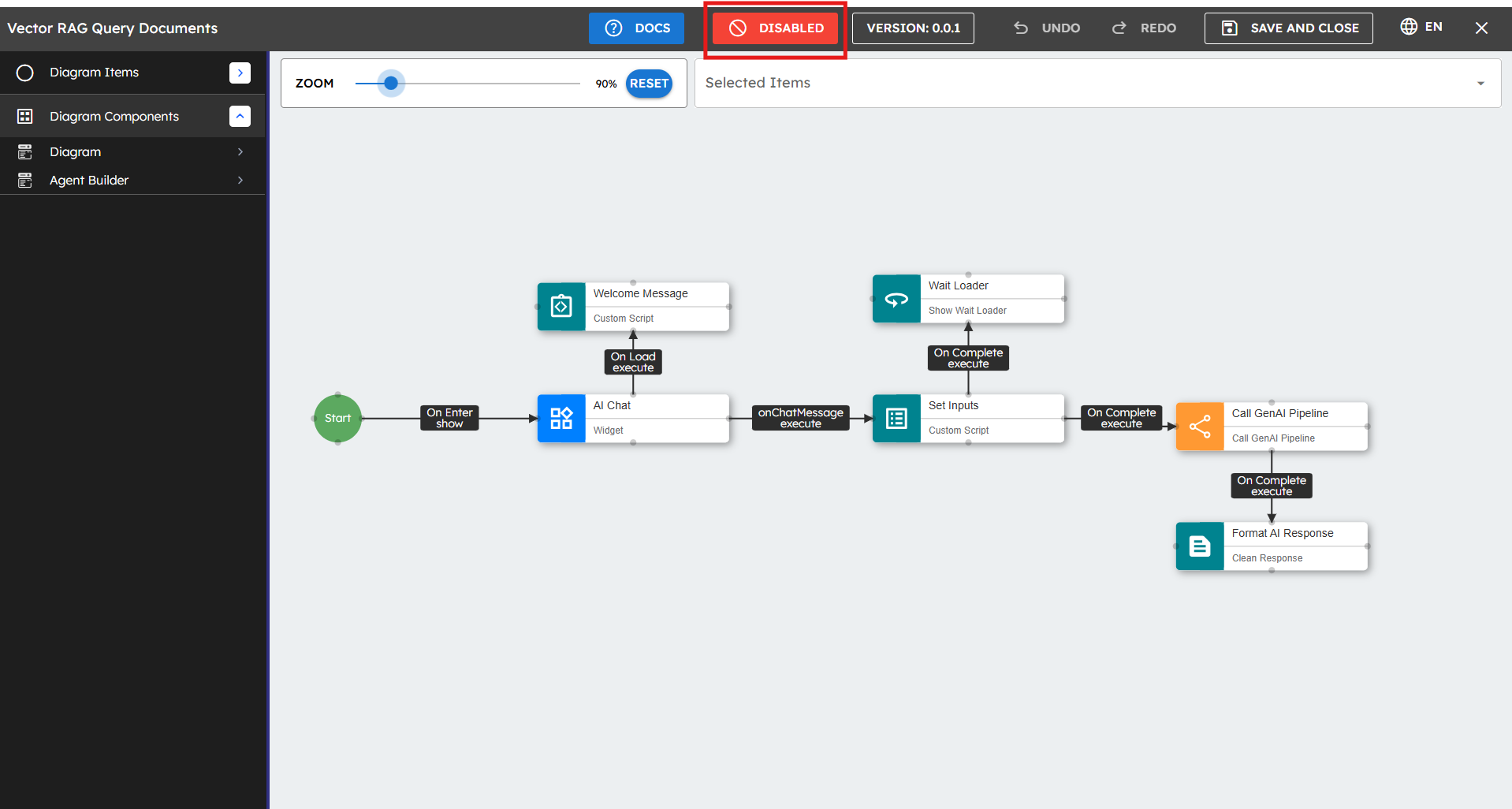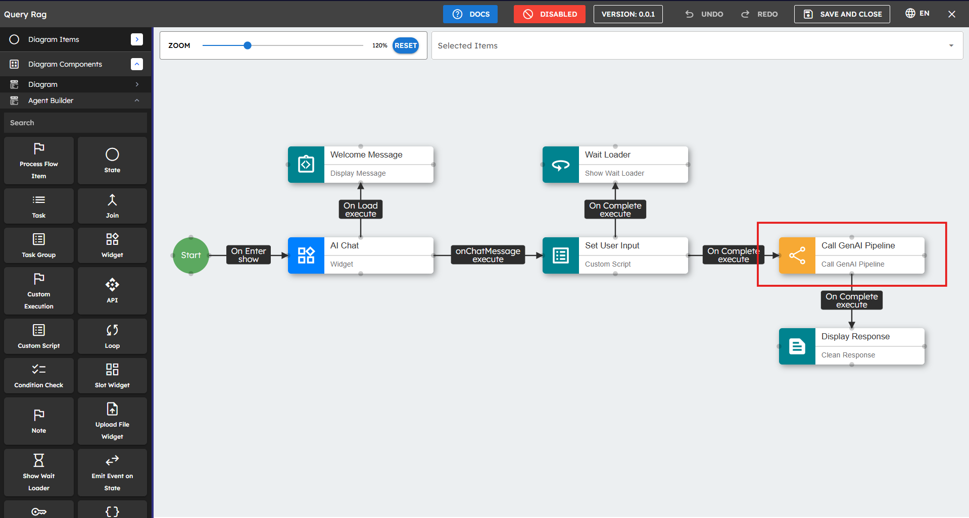 This section shows you how to create Gen AI Agents with components. This process involves selecting appropriate components from the toolbox, arranging them in a logical sequence, and configuring their properties to establish data flow. Pipeline creation begins with defining input parameters, adding processing components such as Generate Text or Call Custom Function, and establishing connections between them. Components can be customized to work with different AI providers while maintaining consistent data handling throughout the workflow. This section shows you the steps to build pipelines, that leverage the platform's visual interface to create powerful AI-driven solutions.