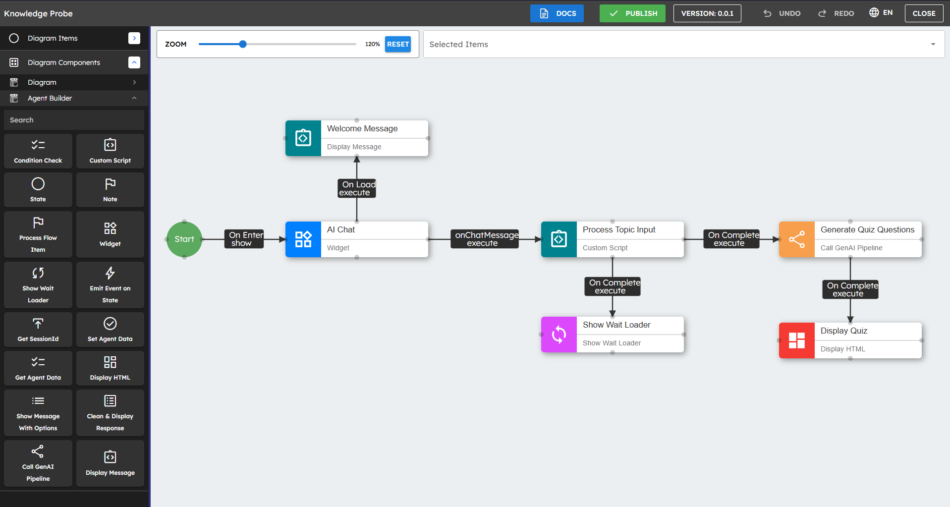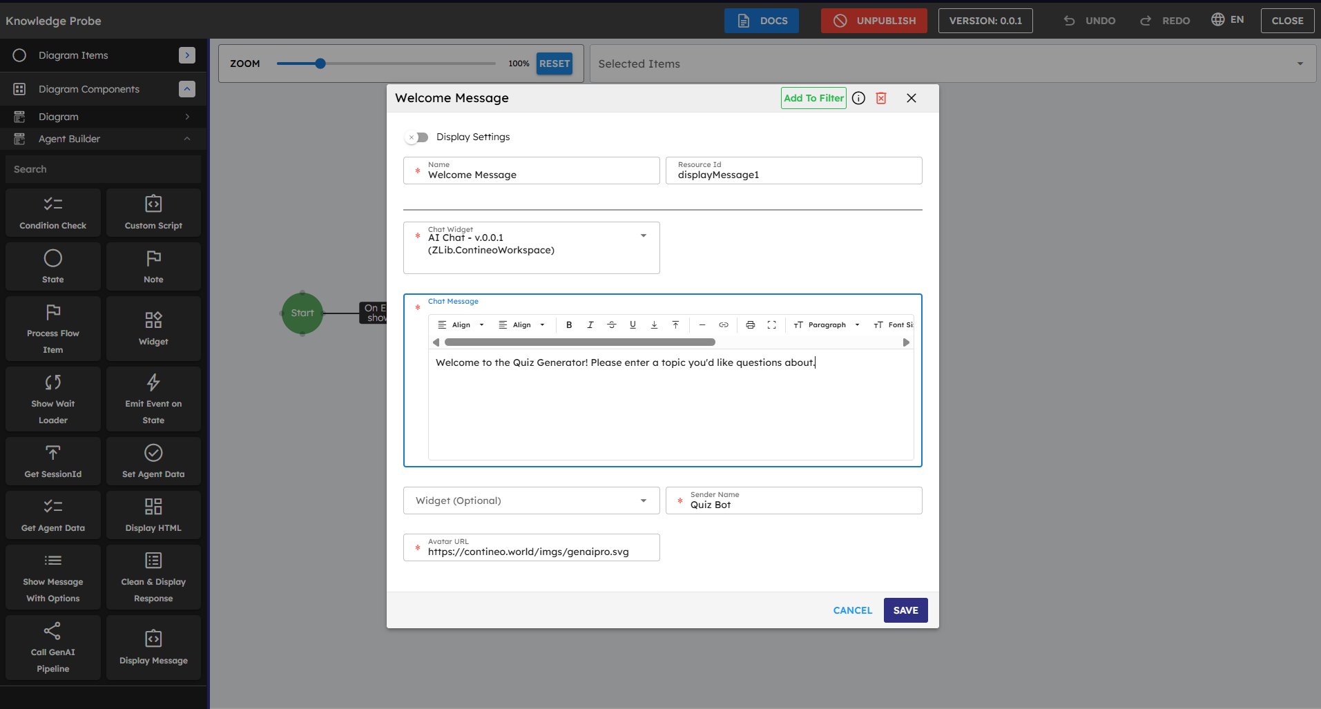 You have successfully created your Quiz Generator Pipeline. Return to your agent in the Agent Builder and connect it to this pipeline. Your agent can now use the AI capabilities you set up to create quiz questions based on user input.
