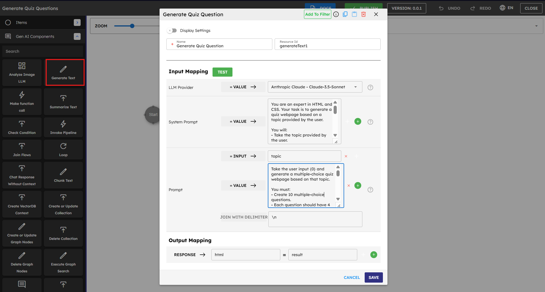 Important: Make sure you create a Quiz Generation Pipeline before attempting this step. Design the pipeline to take a topic as input and return formatted quiz questions as output