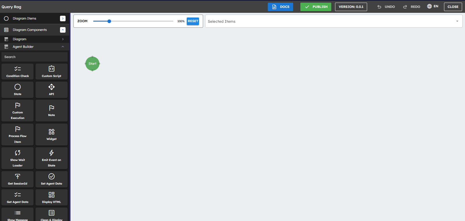Components | It is a drag-and-drop block to create your Agent. Each block performs a specific task such as accessing data from the Vector Database and reading data from files. Reusable UI components to handle inputs, display output, and provide selection options. |