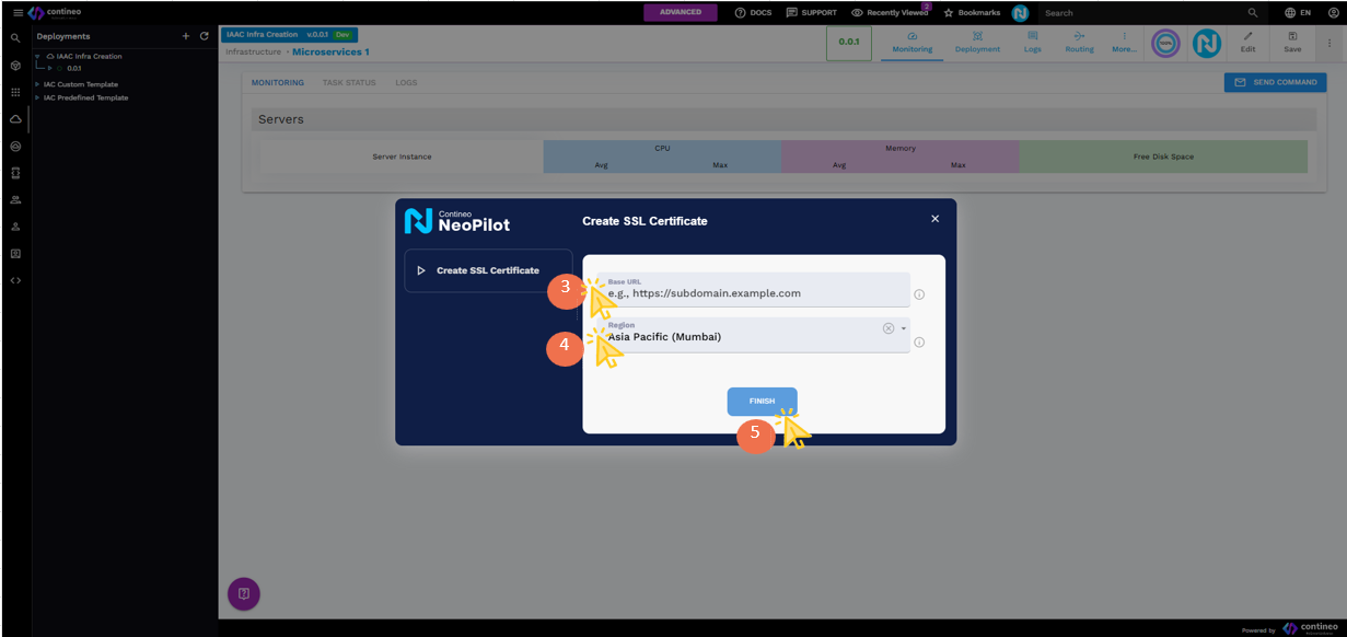 In the popup, enter the Base URL (Domain) of the Microservice / ECS / EC2 for which the SSL certificate is needed.