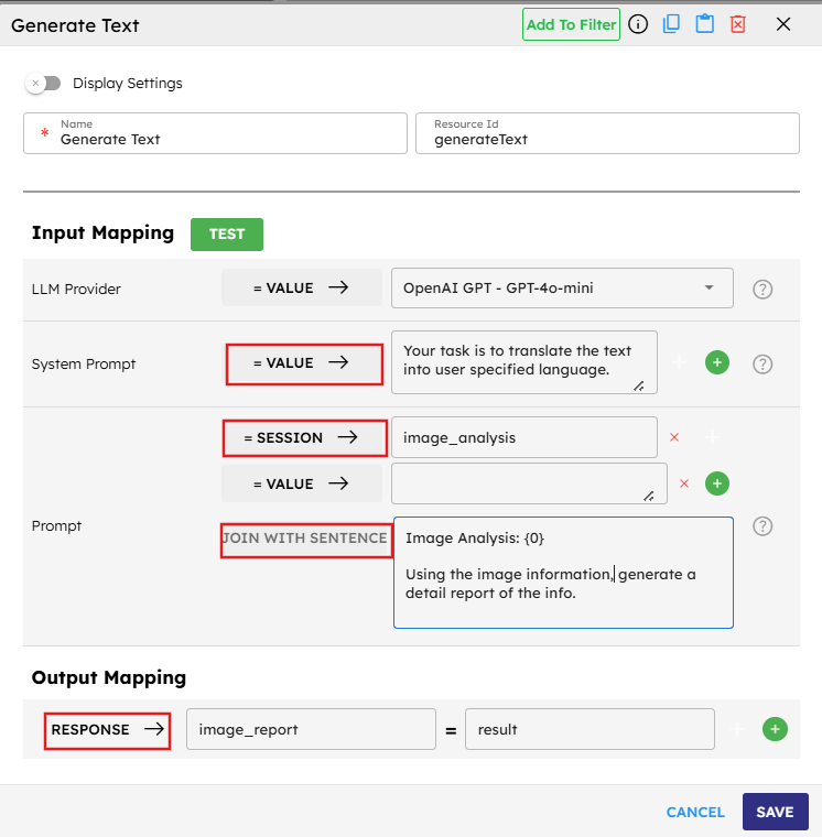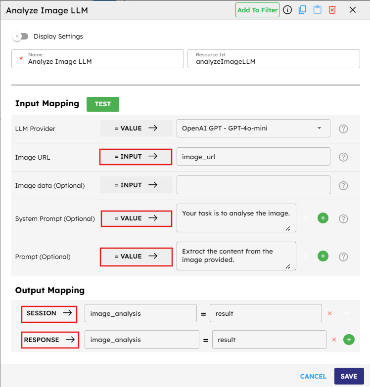 SESSION → image_analysisto store the analysis in a session variable that can be used by subsequent components.Map it to