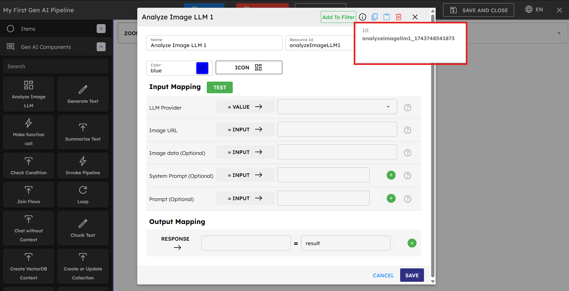 = INPUTbecause the image URL must come from outside the pipeline (such as from a user or another system).System Prompt is set to