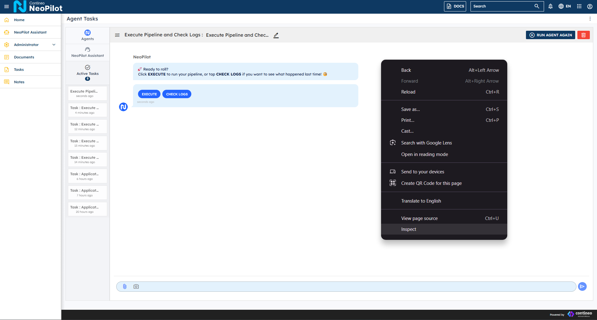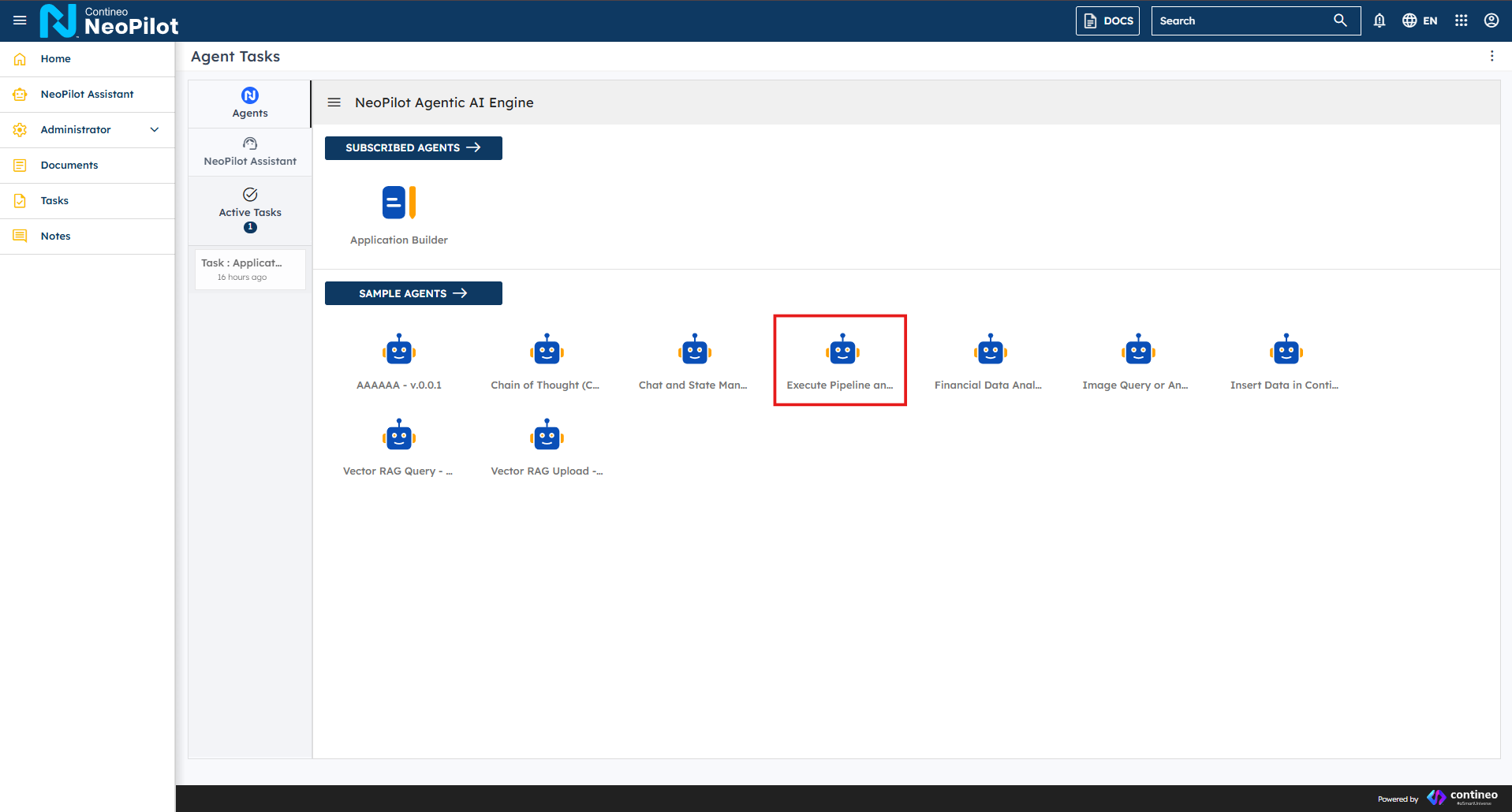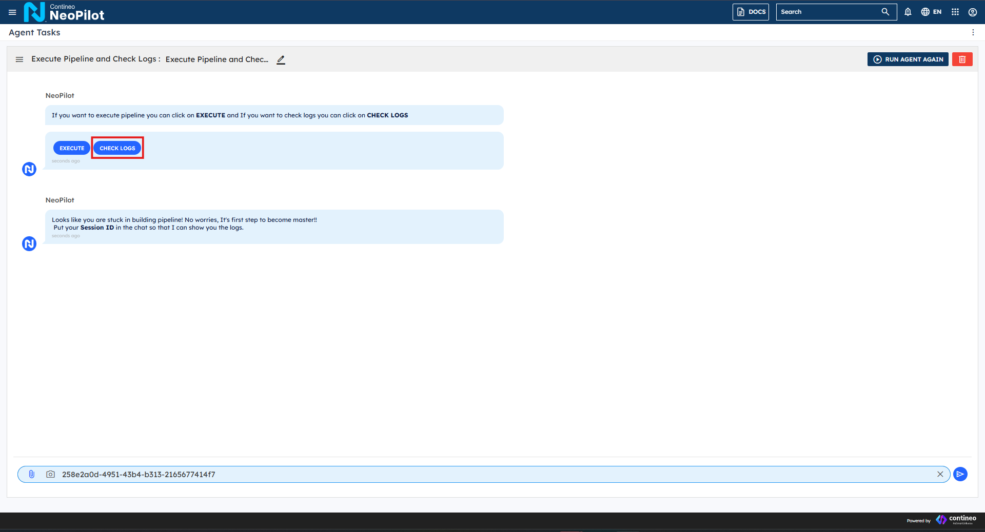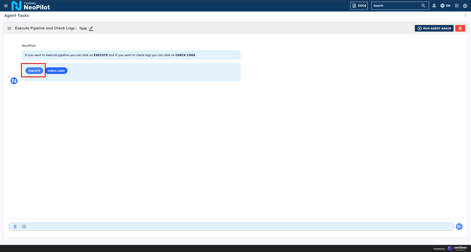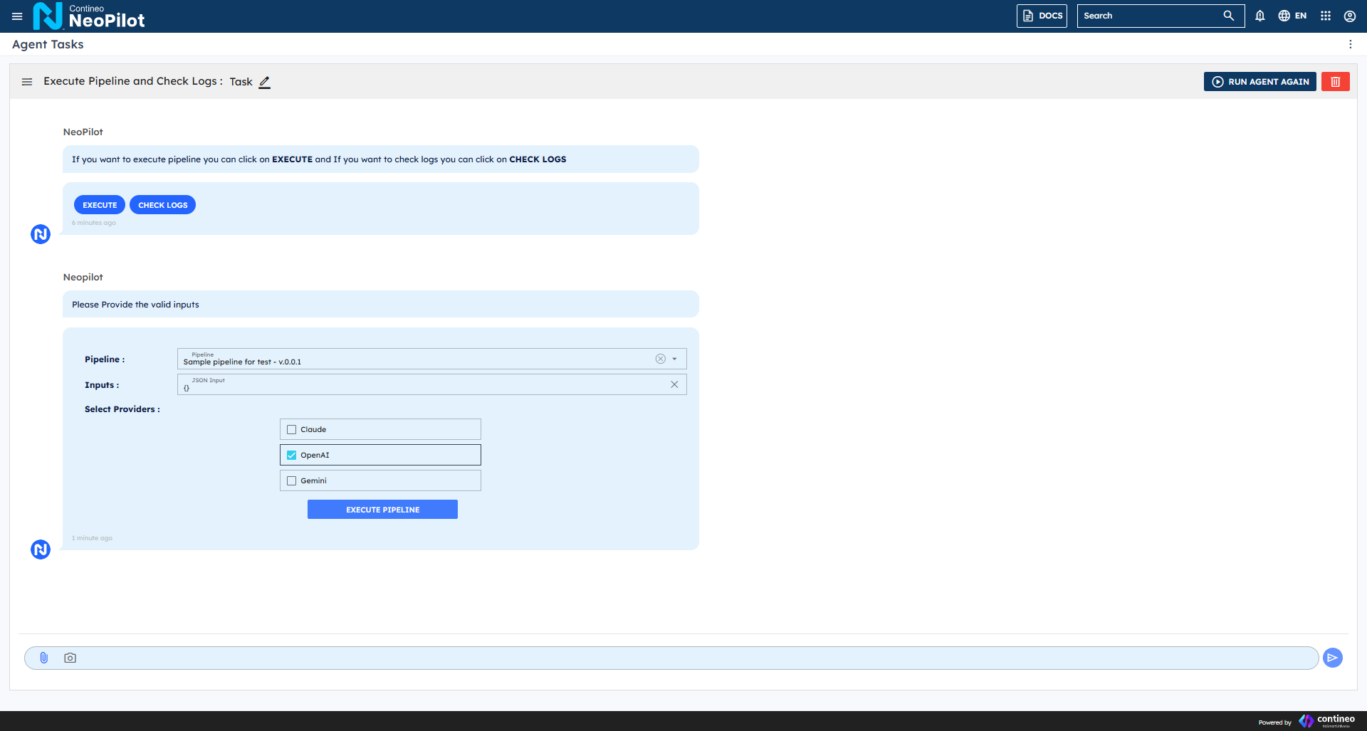 The NeoPilot agent enables you to execute various pipelines and review their execution logs. This component streamlines the process of running AI-powered pipelines and provides detailed insights into their performance through comprehensive logging capabilities.