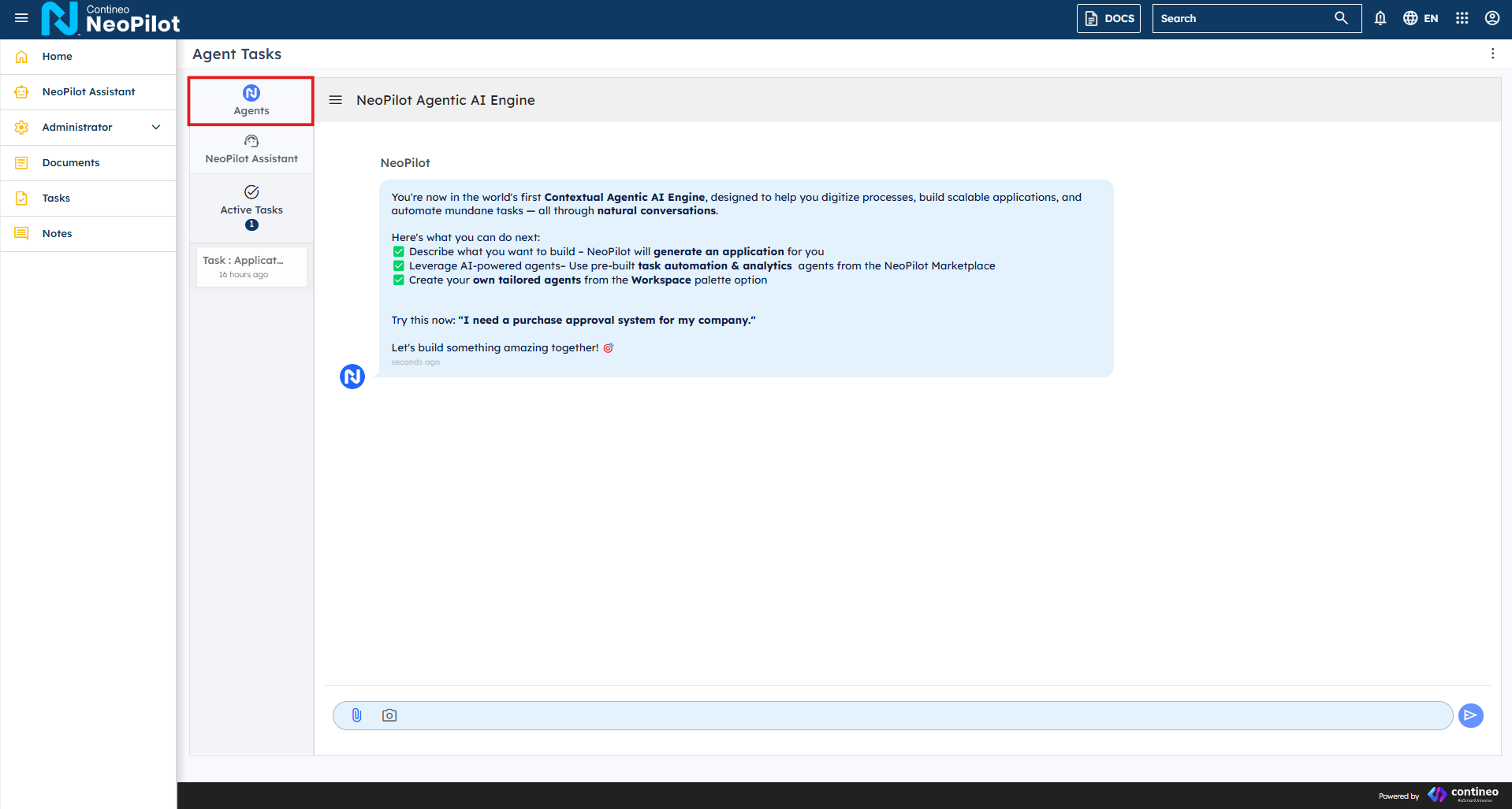 In the main interface, click the Agents tab (highlighted with the NeoPilot logo and "Agents" label).