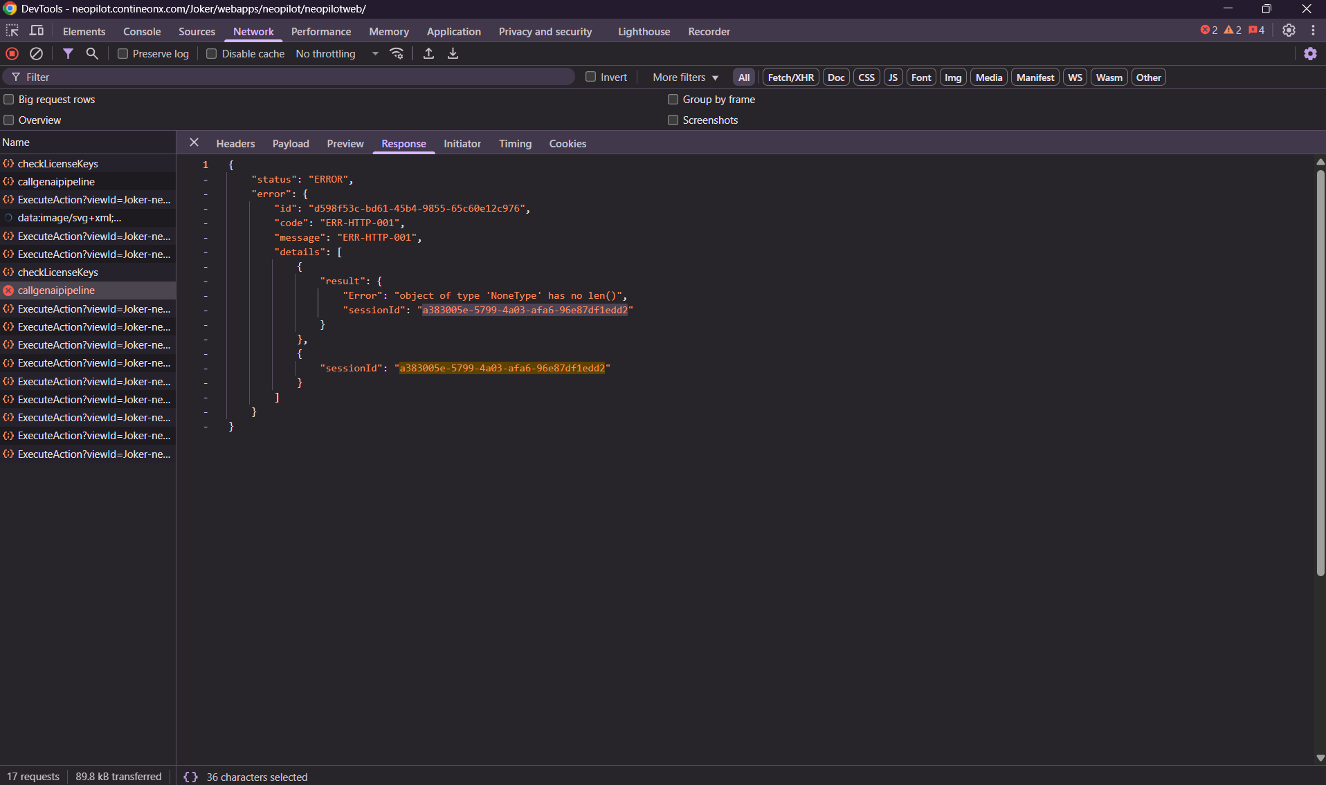 When an agent that uses a Gen AI pipeline experiences an unexpected halt or error during execution, you can retrieve the session ID directly from the browser's developer tools to help diagnose the issue.