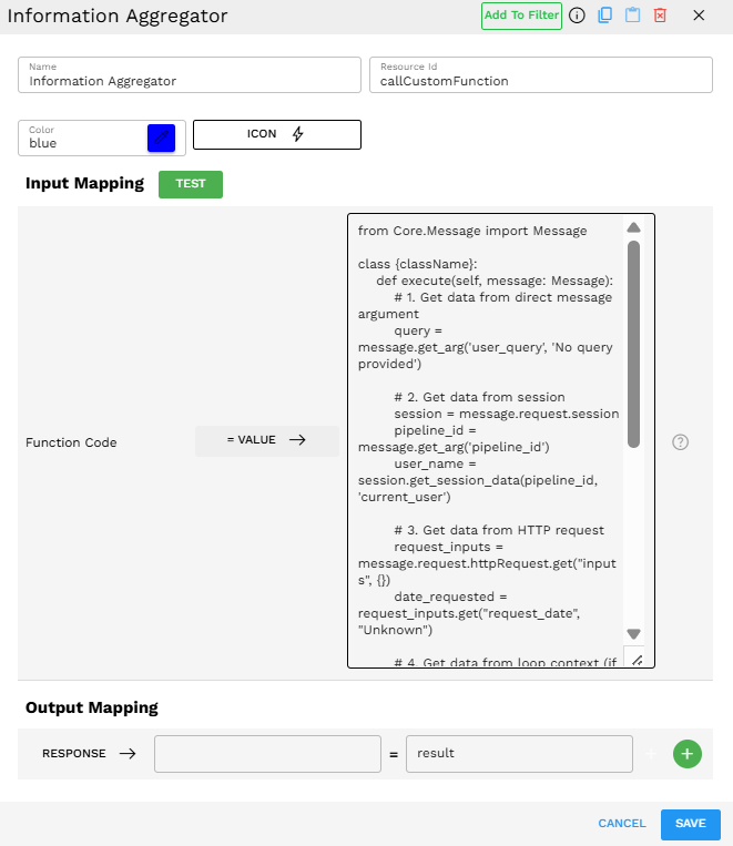 The Call Custom Function component allows you to implement and execute custom Python code directly within your Pipeline Builder. This component provides flexibility to create specialized logic that is not covered by standard components, enabling you to extend the capabilities of your pipeline with custom processing, data manipulation, or business logic.