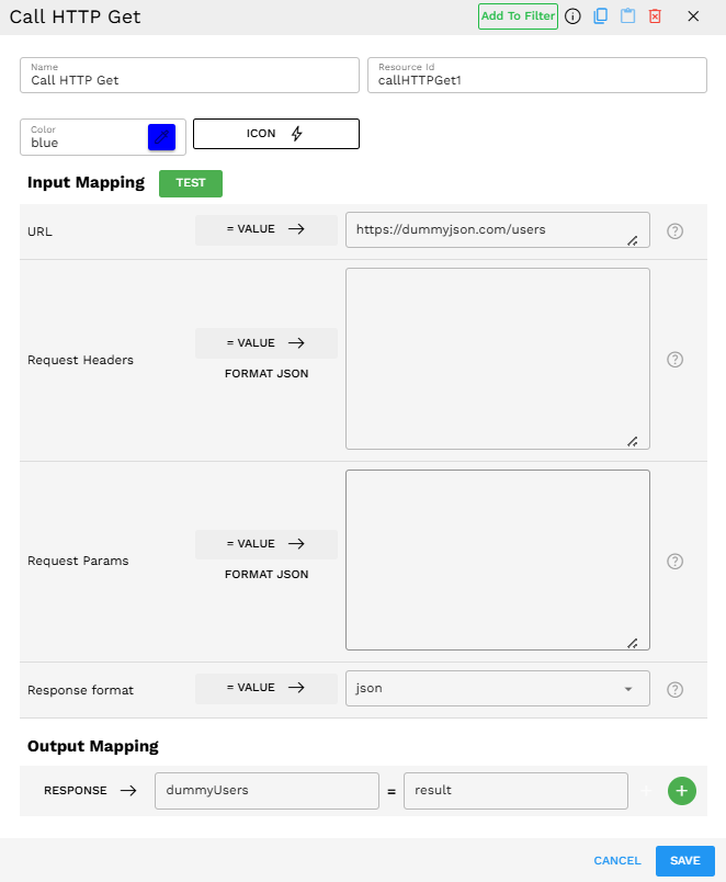 The Call HTTP Get component allows users to make a REST API GET request to a specified URL. This tool is useful for retrieving data from external services, fetching resources, or integrating with APIs that require query parameters and custom headers.