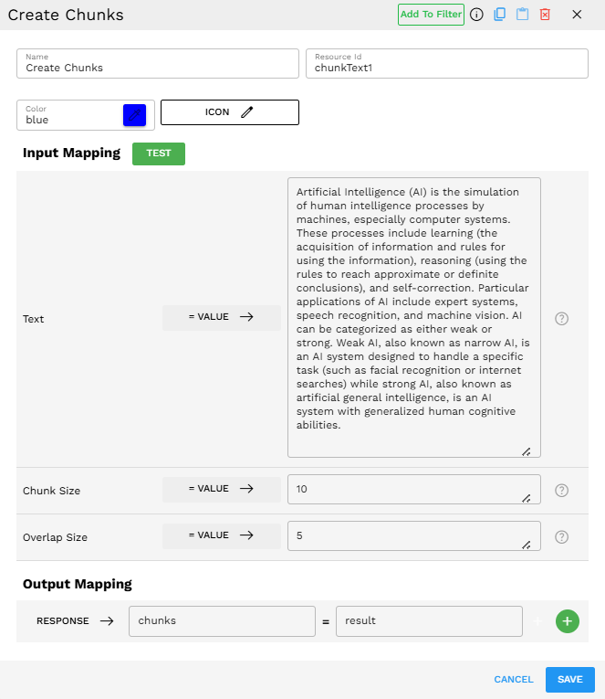 The Chunk Text component divides large text content into smaller, manageable chunks based on token count. This component is essential for processing large documents in Retrieval Augmented Generation (RAG) systems by breaking them down into pieces that can be effectively embedded and retrieved from vector databases. By specifying chunk size and overlap parameters, users can optimize how their text is divided while maintaining context continuity between segments.