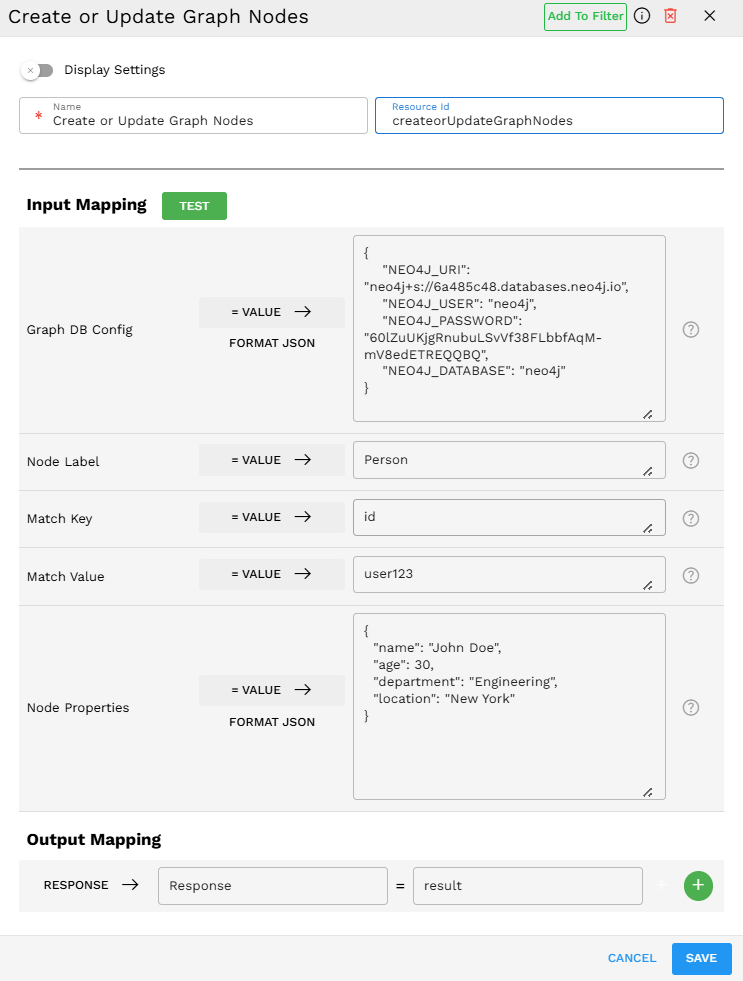 The Create or Update Graph Nodes component enables dynamic management of nodes in a Neo4j graph database within your Pipeline Builder. It provides the functionality to either create new nodes or update existing ones based on matching criteria. The component searches for nodes with a specific label and unique property value, updating them if found or creating them if not found. This makes it a powerful tool for maintaining knowledge graphs, entity records, and relationship data that can be dynamically updated based on new information. Ideal for RAG (Retrieval Augmented Generation) pipelines and applications that require structured graph data management.