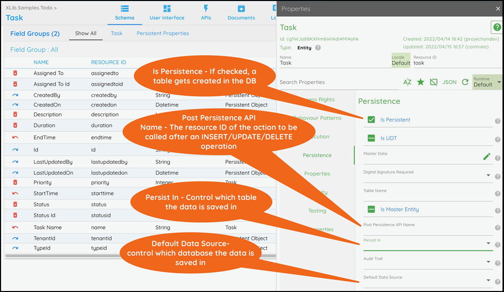 You may specify the post-persistence API for an Entity by providing the action's resource ID in the Persistence > Post Persistence API Name property.