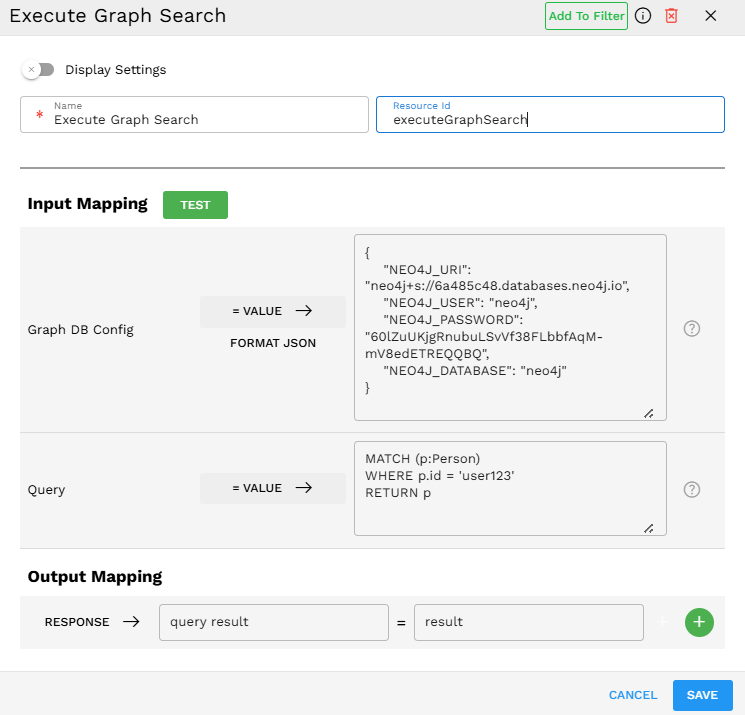 The component maps the response from the Neo4j query to the "result" variable as shown in the Output Mapping section of the configuration. Note that the actual Neo4j query results are contained within the "query result" array, which preserves the structure of nodes and relationships returned by your Cypher query.