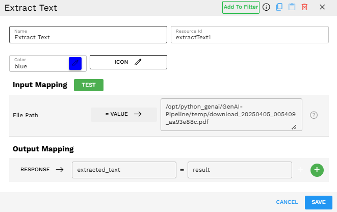 In this example, the File Path input is connected to the output of the Download From S3 component, and the extracted text output can be used by subsequent components.