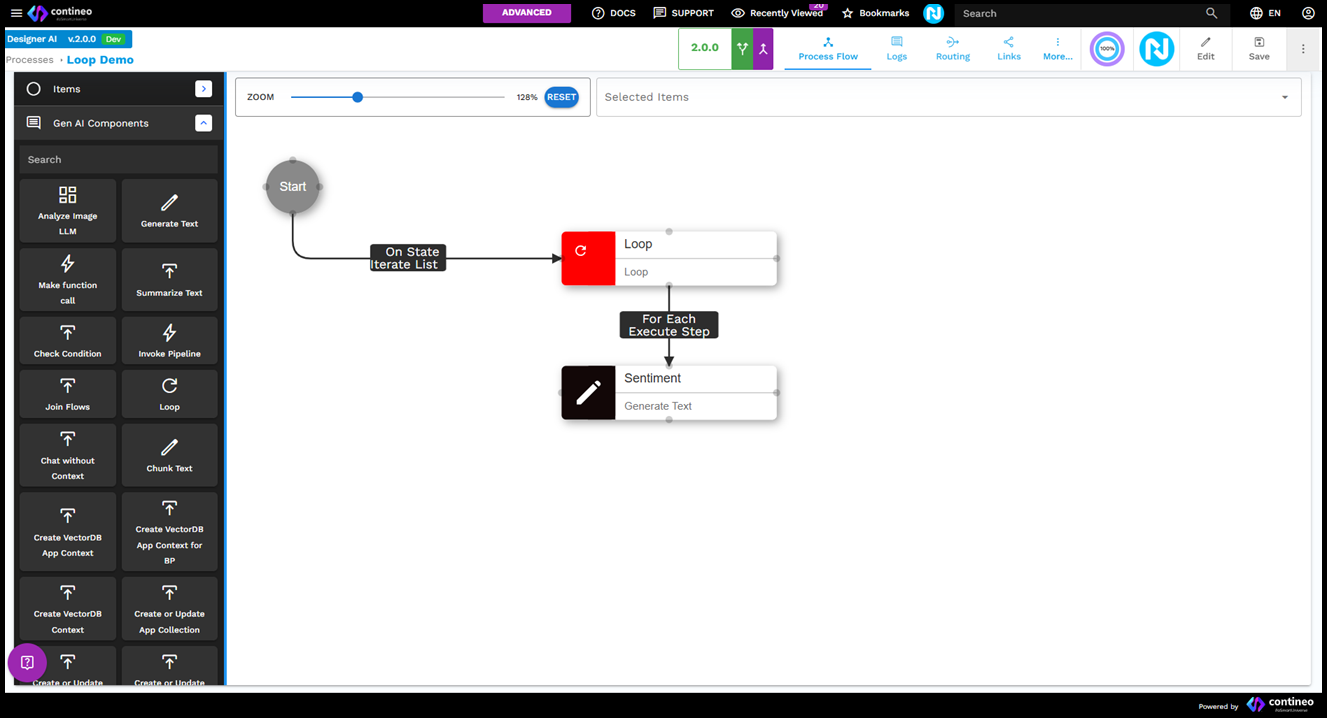 This component is the foundation for batch processing, data transformation across multiple items, and parallel processing workflows. It takes a list as input and makes each element available as 'loop_item' to all components connected via forEach. The loop maintains separate execution contexts for each iteration, preserving session data isolation while collecting outputs from specified components into arrays using the result.stepId format where stepId refers to the unique identifier of components within the forEach chain. The result collection system works by specifying result.stepId (for example, result.generateText1_ABC123, result.customFunction2_XYZ789) in the output mappings, where each result.stepId creates an array containing that specific component's output from every iteration. You can collect results from any component within the forEach chain - first component, last component, middle components, or multiple components simultaneously by configuring multiple result.stepId mappings.