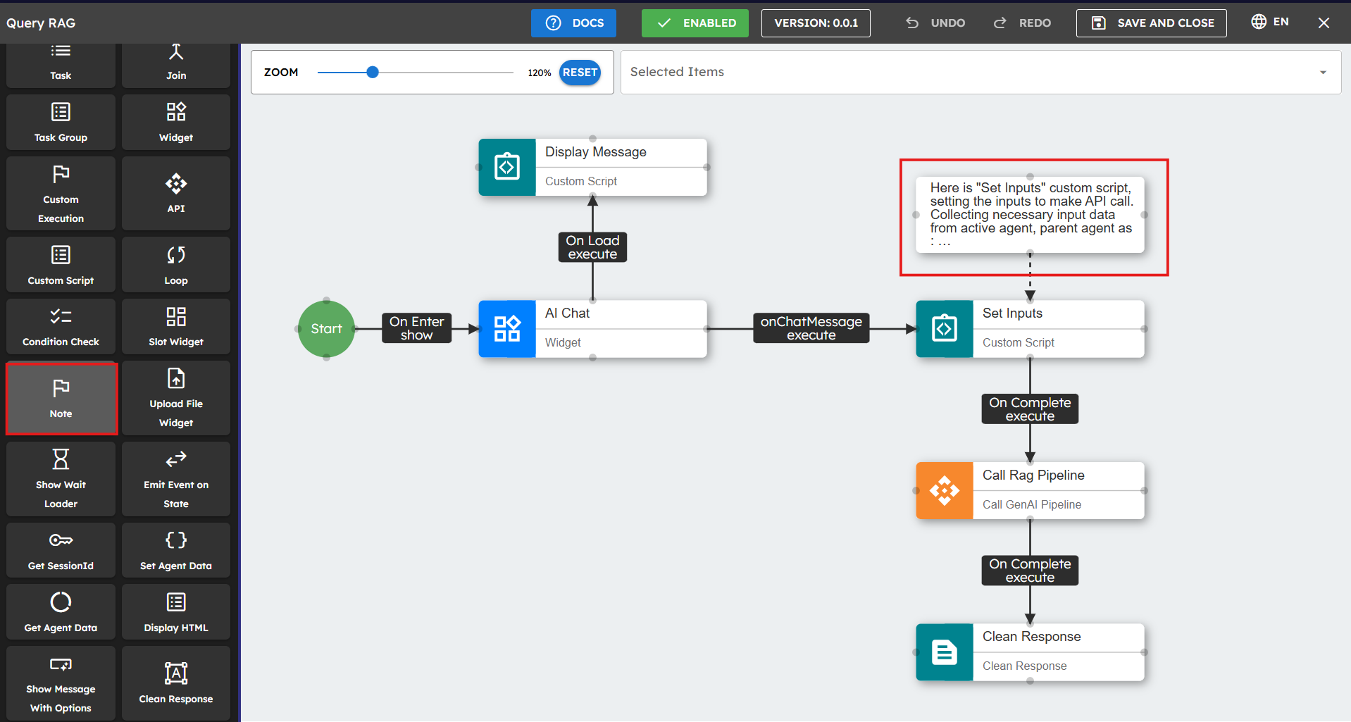 The Note component lets you add text notes to your agent workflow. These notes work as documentation in your flow design. They help explain difficult logic, give context for specific components, or add reminders for future development.