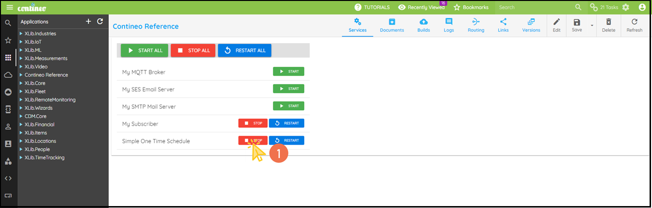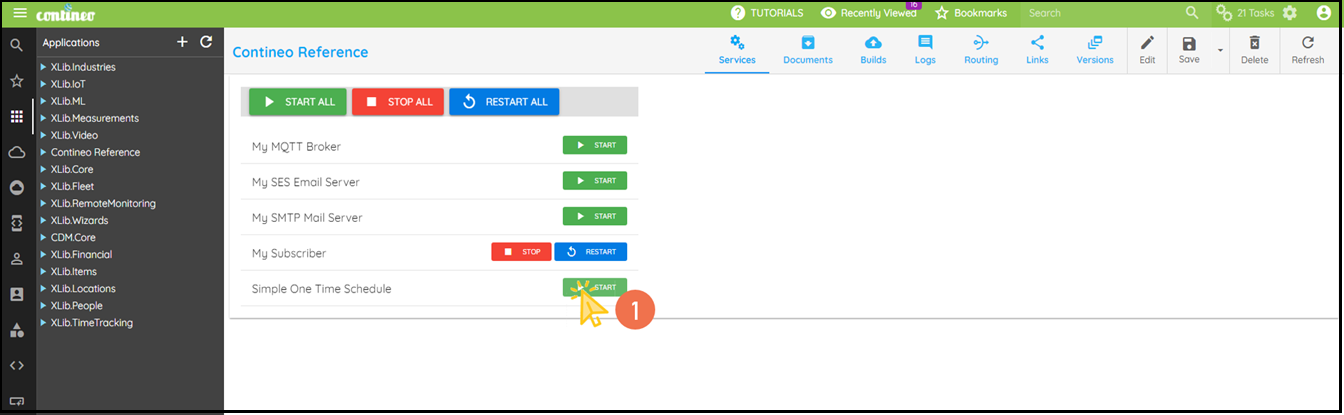 Use the Scheduler Action with the One Time Scheduler to run an action once at a specified time. In Contineo, you can create a One Time Schedule from the Schedules section. This helps you automate tasks that must be executed at a specific time.