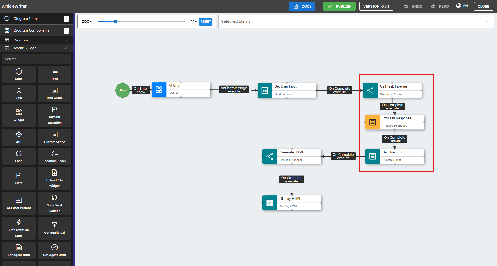 This example shows how to process and display a response using the Process Response Component from a Task Pipeline component in a chat.