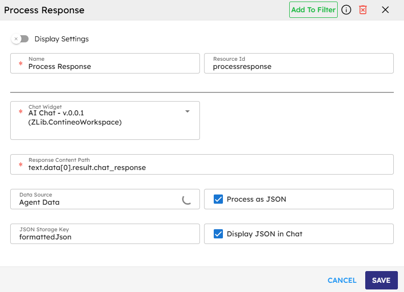 The Process Response (Old name: Clean and Display Response) component transforms and formats data from various sources (AI responses, APIs, or agent storage) for display in a chat interface. It navigates complex object paths to extract specific content, supports both text and JSON formatting with metadata removal, and provides options to display or silently store the processed results. This versatile utility bridges raw data and user-friendly presentations while making formatted information available throughout your agent workflow.
