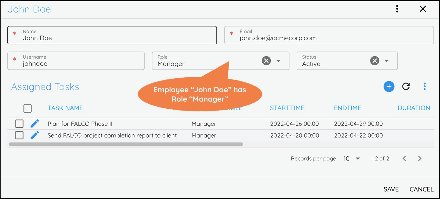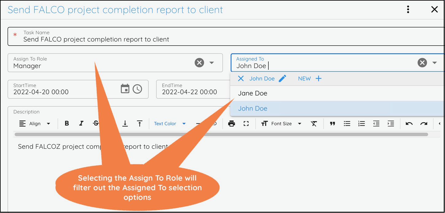 The Task Entity has a Parent(1) field named Assign To Role of data type User Role. This field indicates which roles can perform the task. When creating a task, first select the role in the Assign To Role field. This should automatically filter the Assigned To dropdown list and show only the employees that have that role, as follows:
