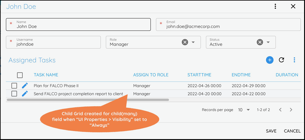 A Child (many) field named Assigned Tasks, of data type Task, is created in the Employee Entity. Unlike Parent fields, the configuration for Child (1/many) fields are to be done manually: