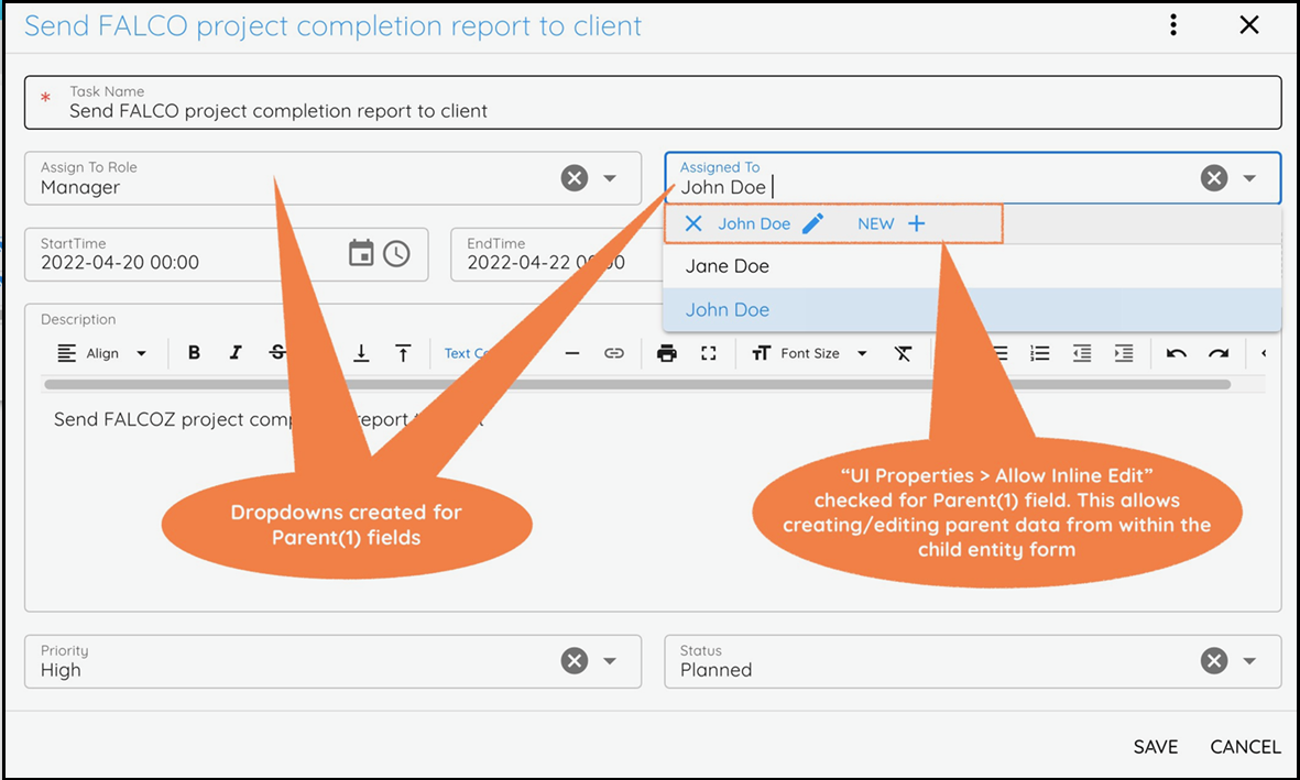 Once this parent relation is configured and the Entity UI is generated, every parent relation is rendered as a dropdown list. To enable inline creation of parent data, check the UI Properties > Allow Inline Creation property of the Parent(1) field.