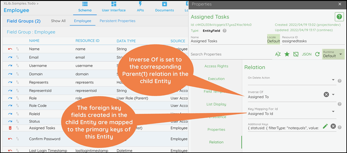 Example: Consider the data model of the XLib.Samples.Todo library with Entities Task, which represents a task in a To-do list, and Employee, which represents an employee or person who has assigned tasks.