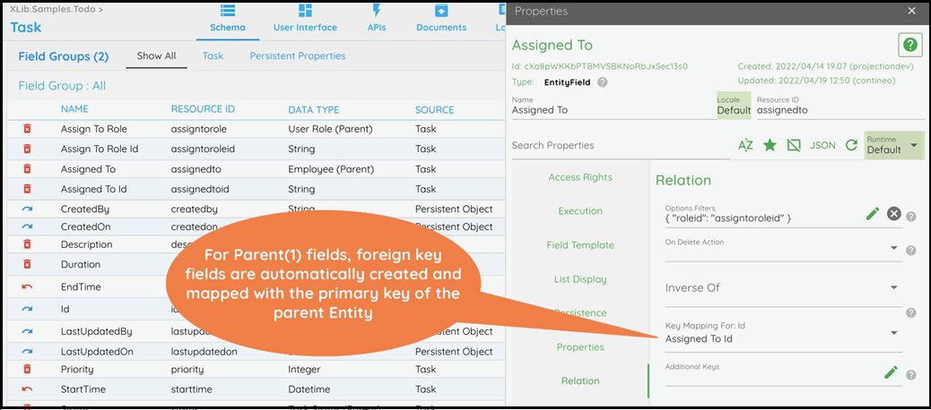 Once created, the foreign key fields required in the database are automatically added to the child Entity. In this case, a field called Assigned To ID is created in the Task Entity. This field is hidden by default. You can see hidden fields by using the Show Hidden Fields toggle on the top right of the Fields list.