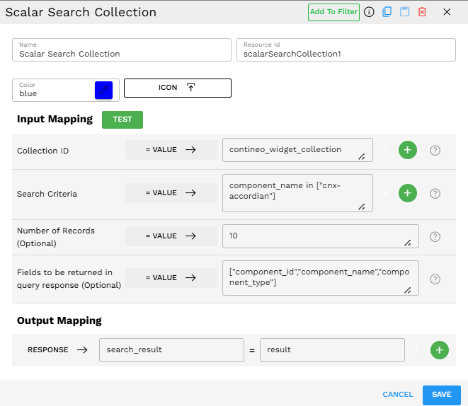 The Scalar Search Collection component performs exact field-based searches on vector database collections using SQL-like query criteria for precise data retrieval without semantic similarity matching. This component enables traditional database-style querying within vector collections, allowing users to search for specific field values, apply conditional filters, and retrieve exact matches based on metadata attributes rather than content similarity.
