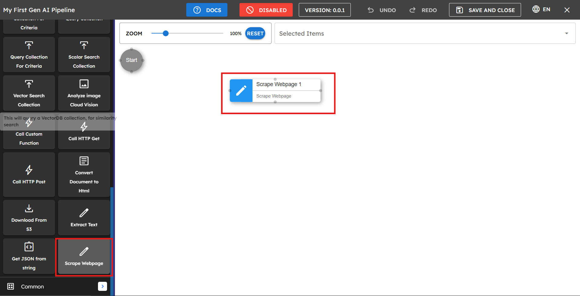 Drag the Scrape Webpage component from the component list to the main pipeline area.