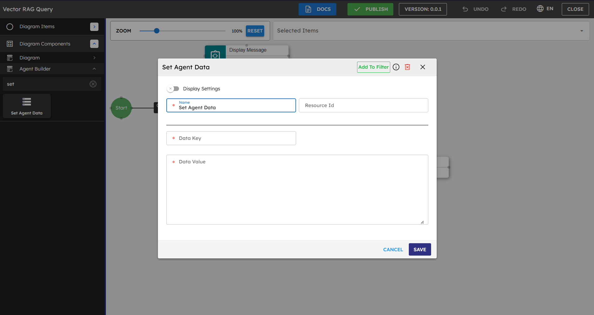 The Set Agent Data component stores key-value pairs in the agent's data cache. This component serves as a mechanism to persist information throughout an agent's execution lifecycle, allowing data to be saved and accessed by other components within the same agent workflow.