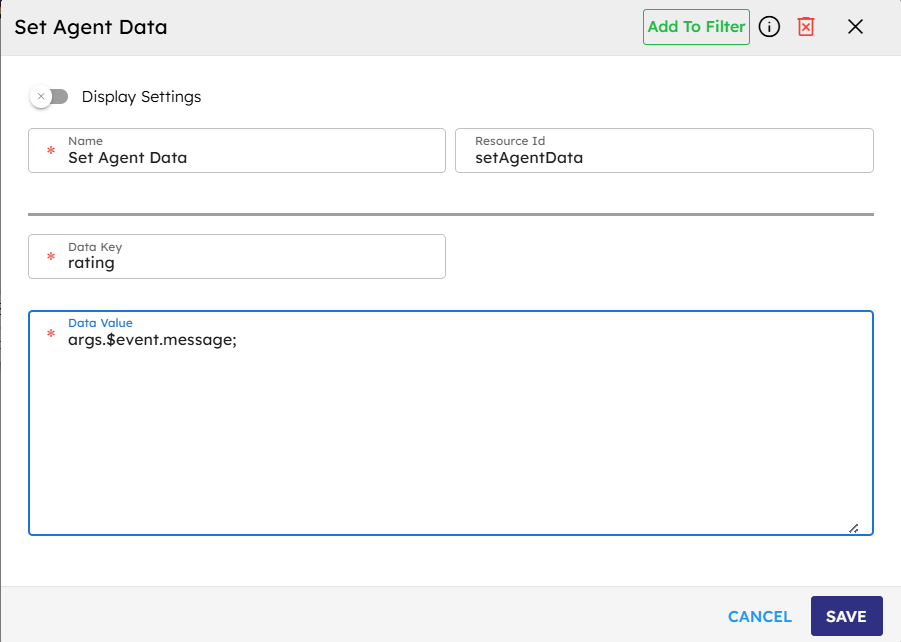 // Data Key: conversationContext// Data Value:{ userMessage: args.$event.message, timestamp: newDate().toISOString(), sessionId: this.agent.data.sessionId || Math.random().toString(36).substring(2), messageCount: (this.agent.data.messageCount || 0) + 1}This example shows how you can create a complex data structure that combines event data, current time, and existing agent data values to build a rich conversation context.