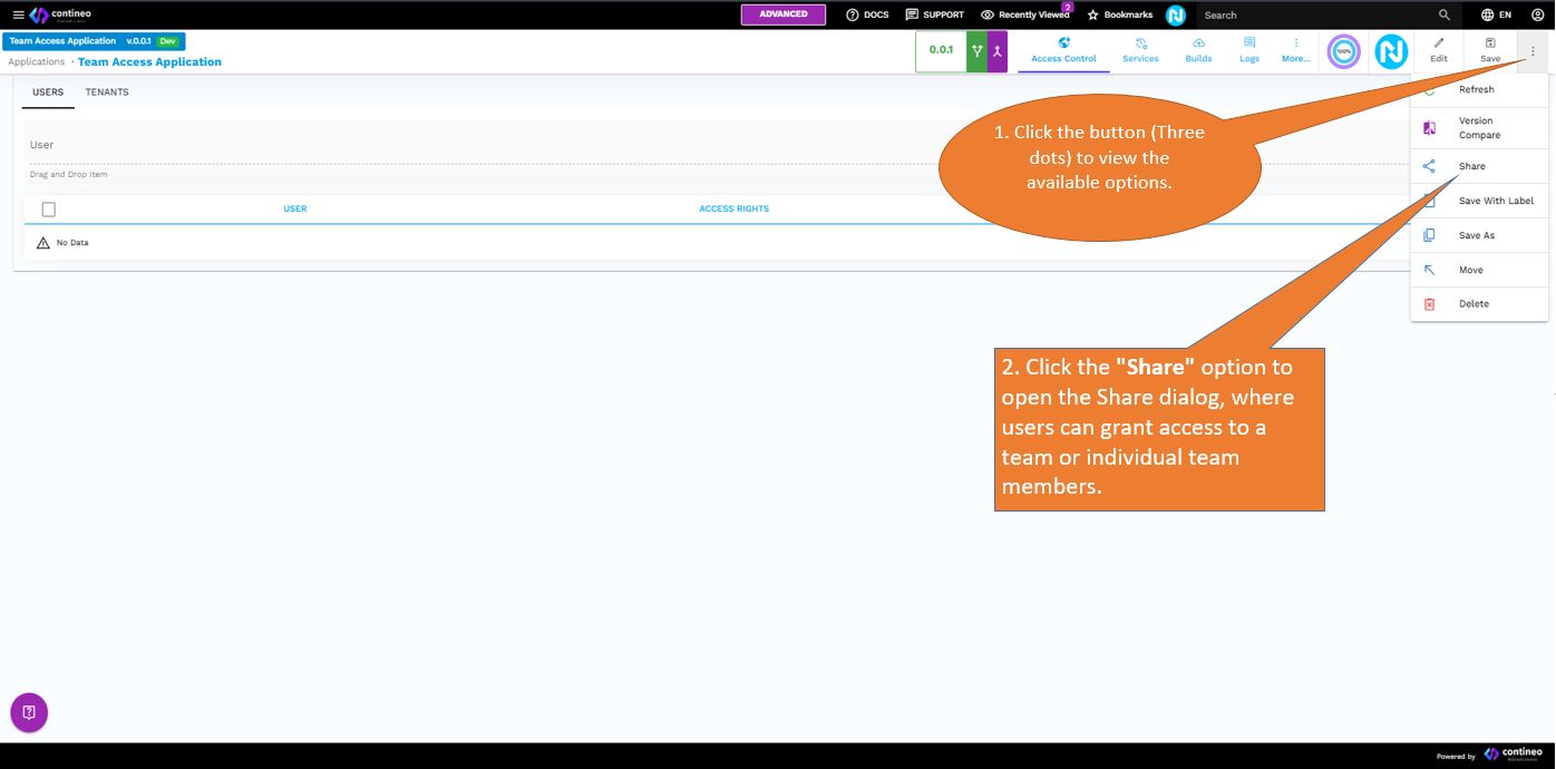 Click the Share option to open the Share dialog, where users can grant access to a team or individual team members.