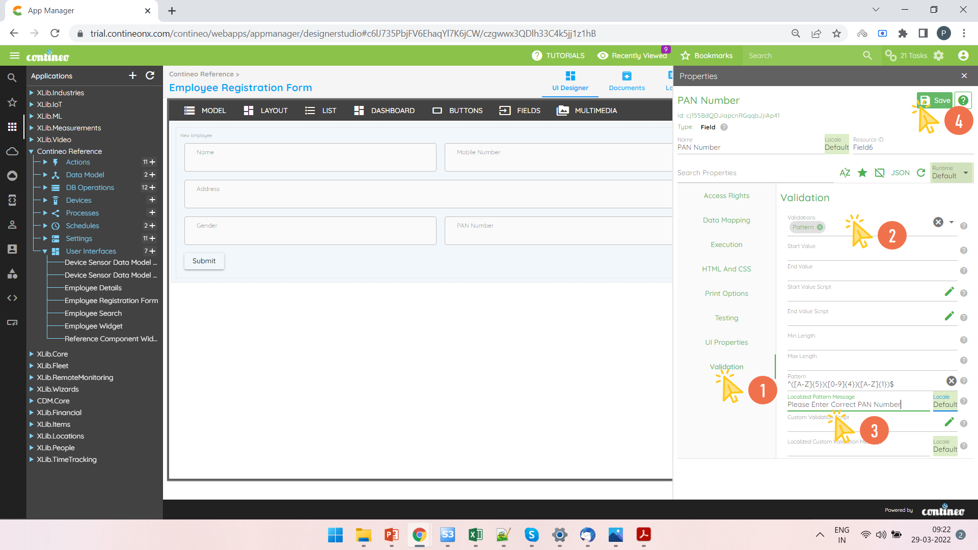 Example 3: Employee PAN Number should follow a specific pattern in the Employee Registration form
